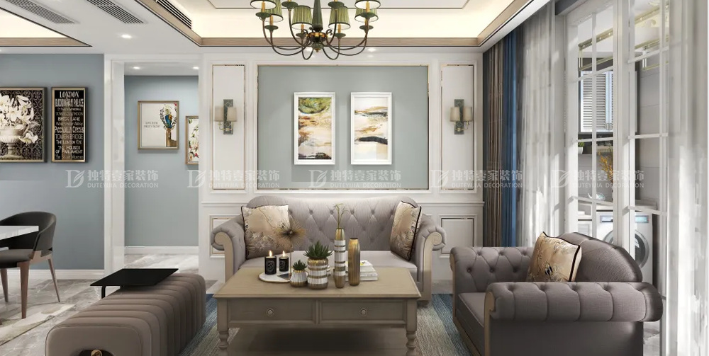 设计说明:本案例来自保利香槟楼盘项目,房子结构三室两厅一厨两卫户型,设计上选择了现代美式风格为空间主题装修风格!相比传统美式风格的吊梁画柱,设计的复杂性,现代美式风格更具有包容性,同时更符合年轻人的家居要求、审美品位。现代美式风格装修,整体以追求高雅、华丽为主,但同时也追求简洁性。通常现代美式装修色彩会选择偏向白色等浅色系,借助丰富花饰、线条、质感的窗帘等作为装饰品,进而来突出现代美式装修风格的特点,带来浪漫舒适的装修效果。